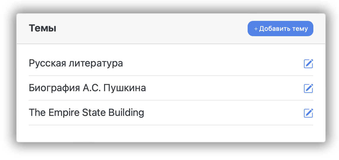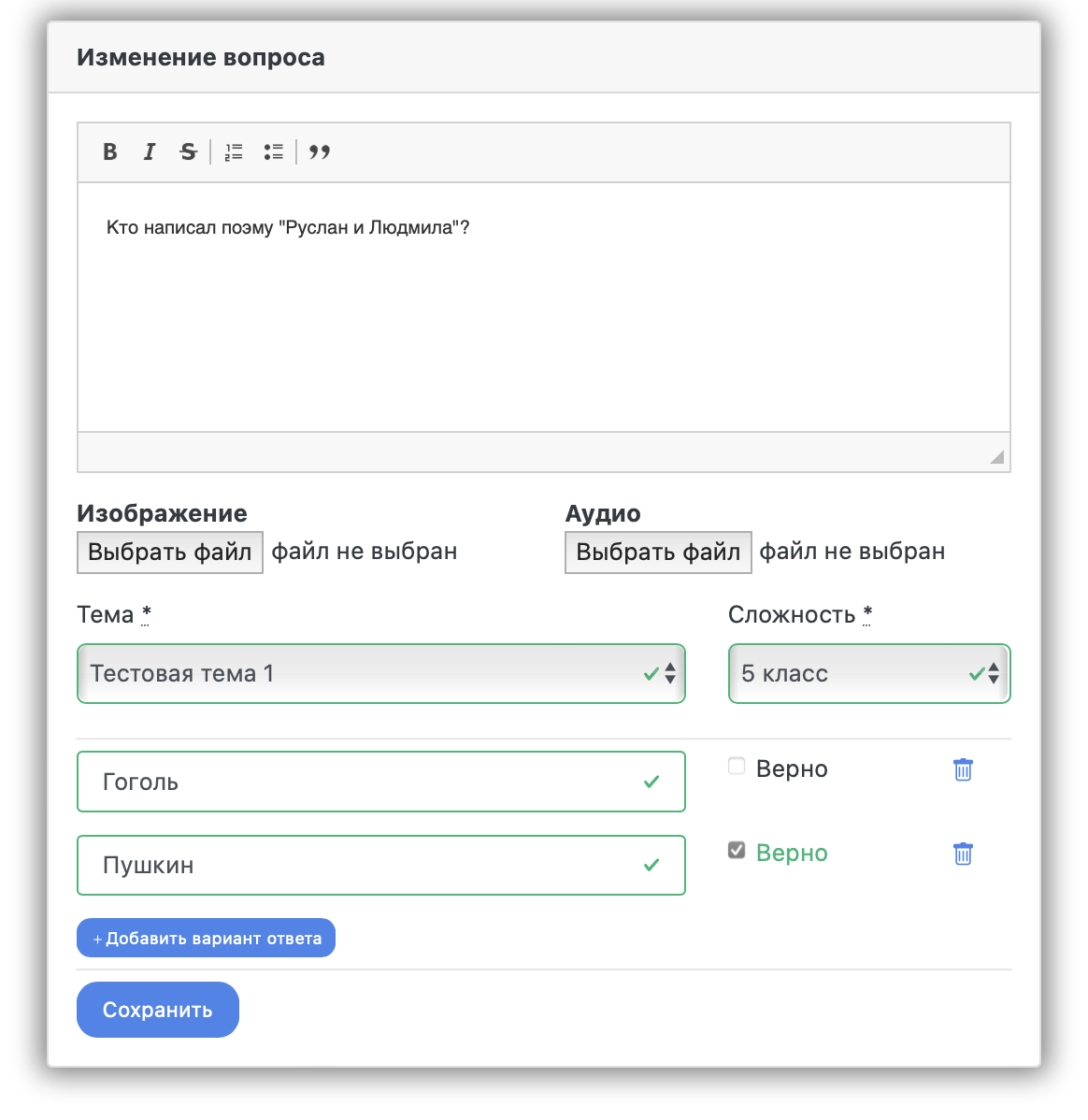 Перед наполнением Вашей базы вопросов придумайте и создайте Тему, к которой вопросы будут относится и Уровень Сложности. Например, для вопроса "Кто написал поэму 'Руслан и Людмила'?" темой может быть "Русская литература", а Уровнем Сложности может быть "5 класс школы". Вы можете использовать любые названия для Тем и Уровней Сложности, удобные для Вас или общепринятые, такие как 'A1' или 'B2'.