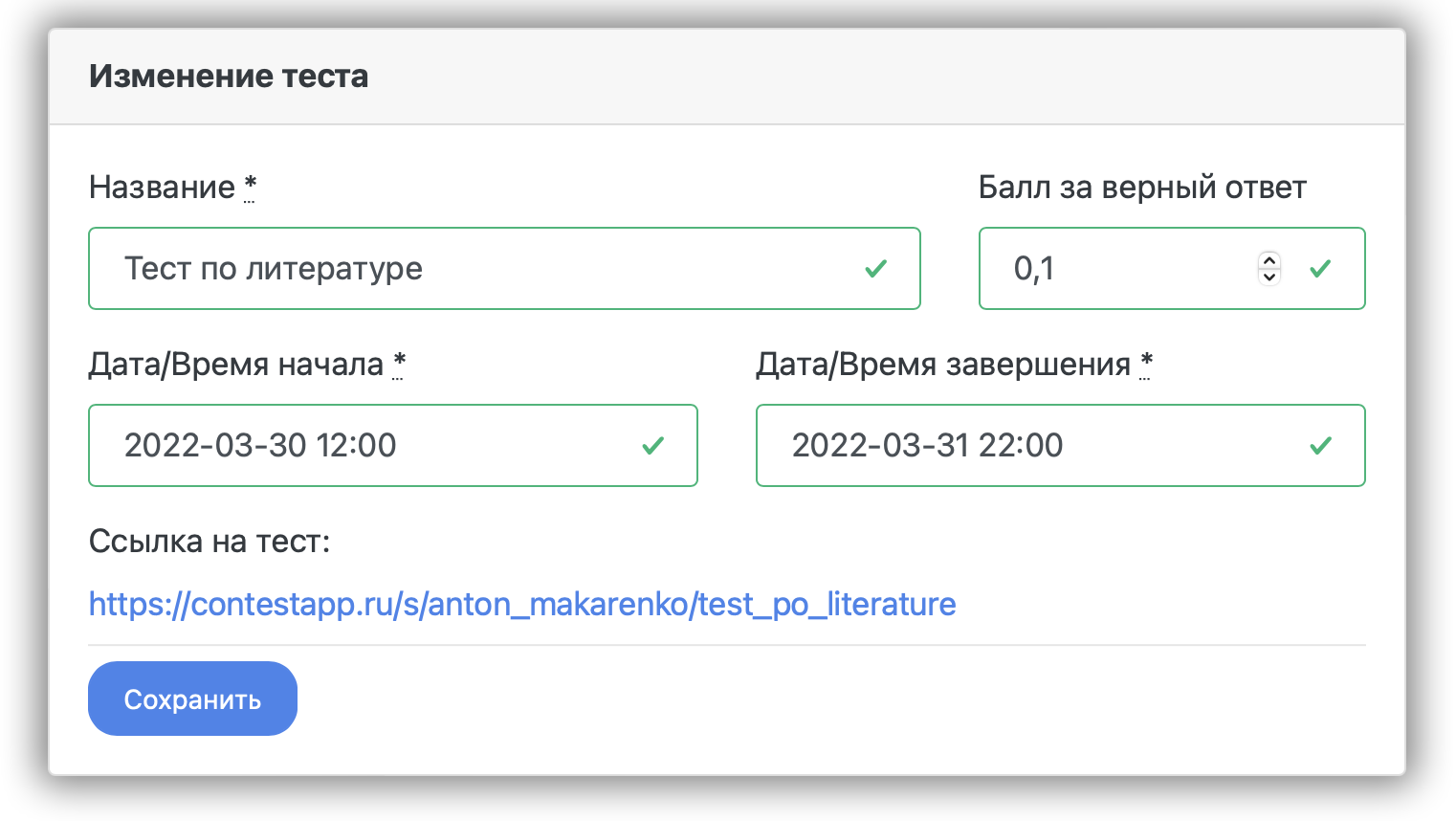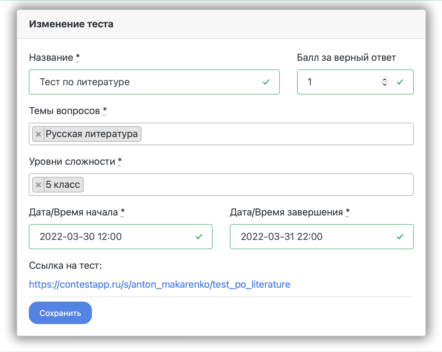 В форме создания/изменения теста Вы видите ссылку. Это уникальная ссылка на созданный Вами тест. Скопируйте её и дайте своим ученикам или студентам. Открыв тест по этой ссылке в период, когда тест доступен, они увидят приглашение начать тест: