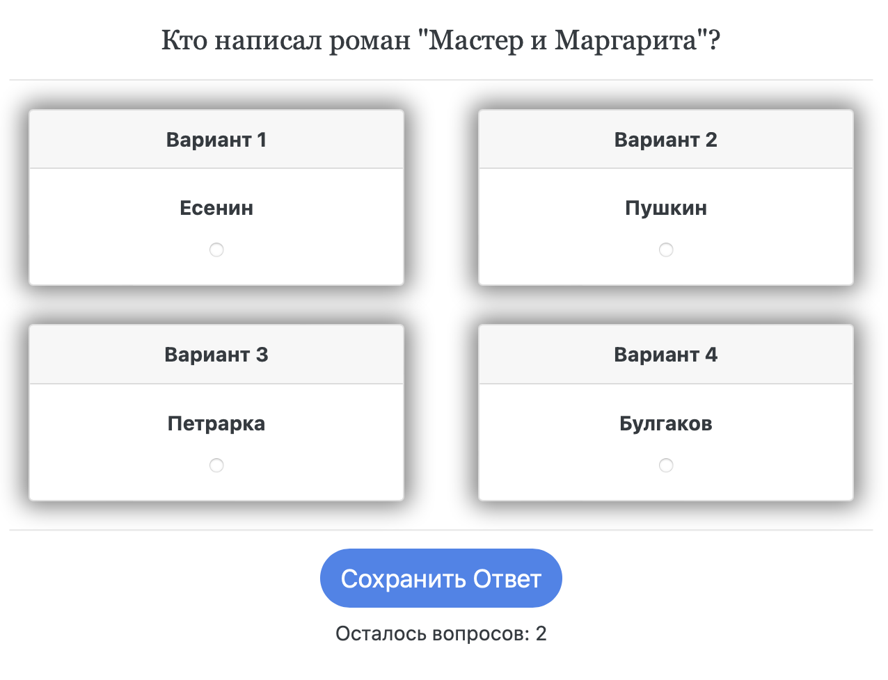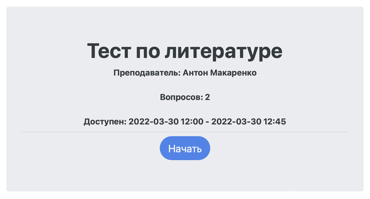 Нажав на кнопку "Начать" Ваши ученики и студенты могут приступать к тестированию: